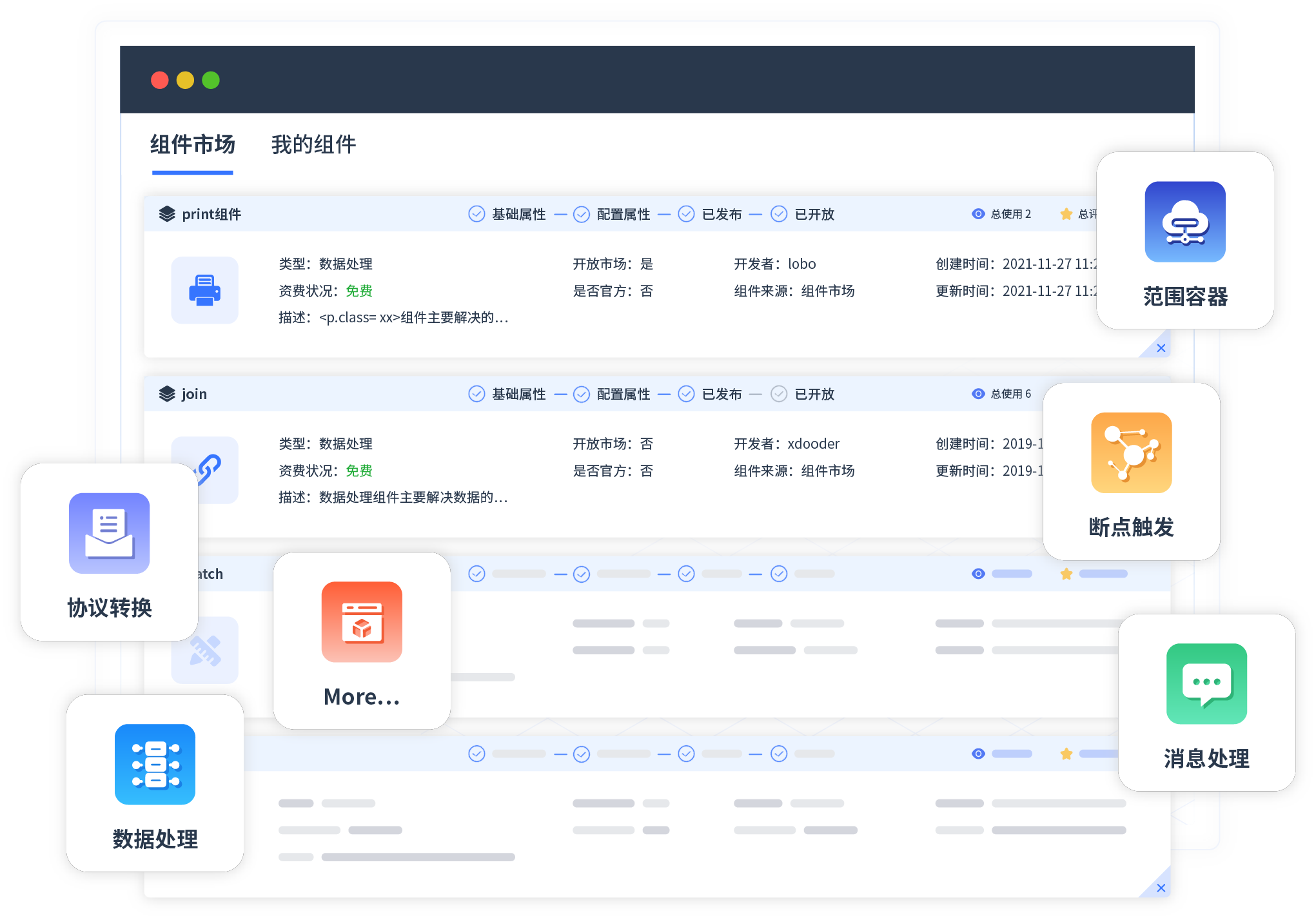 针对集成场景,,VIVO钱包提供组件市场,,例如协议转换、、、消息处理、、、文件操作等。。除平台提供的组件外,,客户可以自定义所需组件。。。
