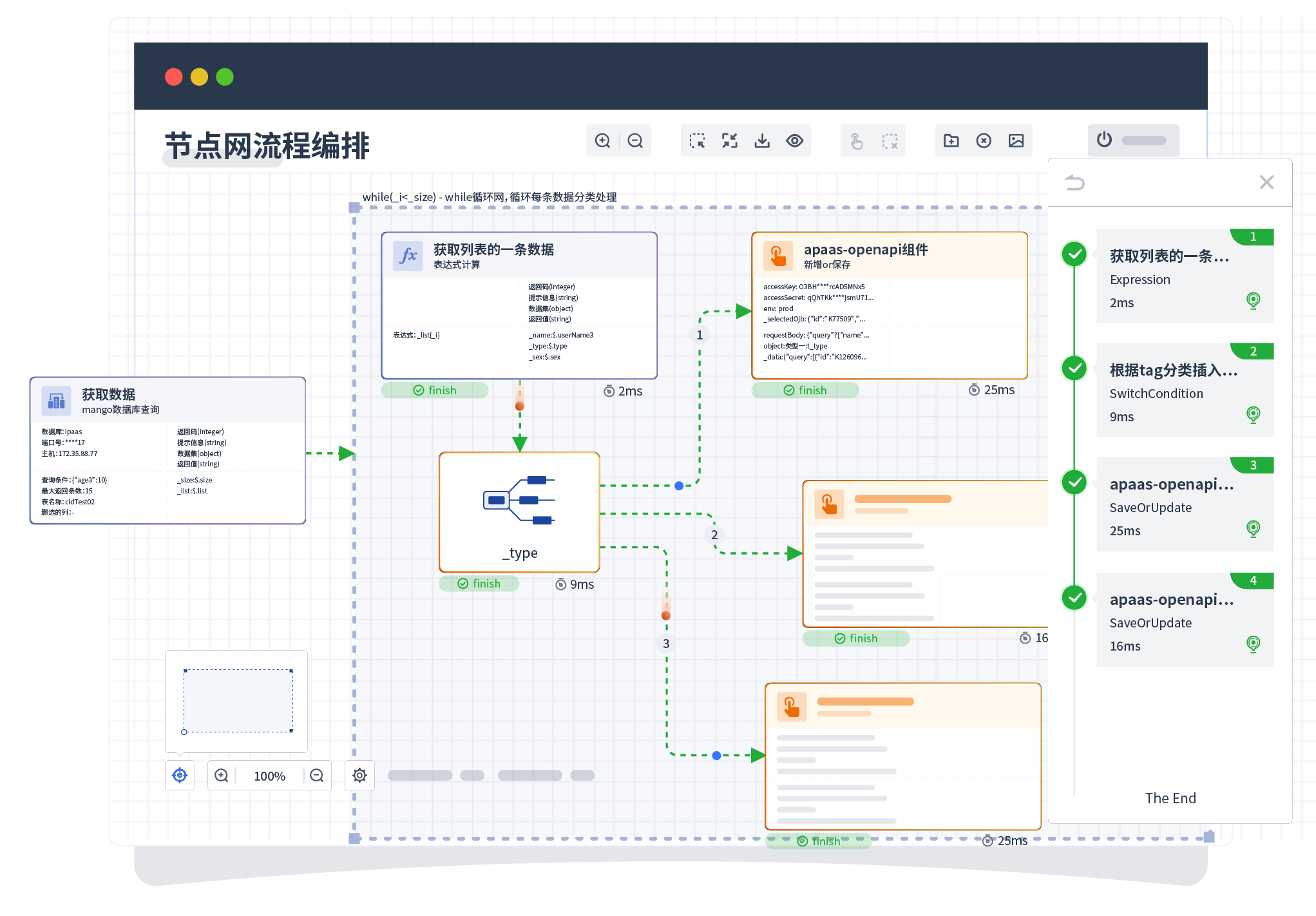 针对集成场景,,,组件定义后支持进行流程编制,,不同于传统代码方式,,,通过图形化展示,,支持在线调试、、、、日志查看和运行回放。。。。